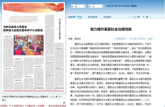 2023年11月30日,《光明日报》理论版发表我校人文社会科学学科建设指导中心主任、东莞市社会治理研究院院长、东莞市社科名家工作室(社会治理)首席专家、法律与社会工作学院陈成文教授的理论文章《着力提升基层社会治理效能》。该文认为,基层社会治理是国家治理的基石,是推进国家社会治理体系与治理能力现代化的关键一环。只有坚持以习近平总书记关于治理效能的系列重要论述为根本指导,才能使基层社会治理“释放积极效能”,实现基层社会治理社会化、法治化、智能化与专业化的效能。该文指出,效能是基层社会治理的目标所向,基层社会治理效能是衡量基层社会治理成果的重要尺度。基层社会治理效能是指基层社会治理主体有计划、有目的、有组织地开展基层社会治理活动所获得的效率、效果、效益和所展示的能力。换言之,基层社会治理效能是对基层社会治理目标的正确性及其实现程度的综合反映。基层社会治理效能提升是一个综合性的社会工程,涉及到治理理念更新、治理体系建设、治理能力提升、治理环境营造等诸多方面的问题。要提升基层社会治理效能,就必须坚持问题导向,直面基层社会治理难题,补齐基层社会治理“短板”,打通基层社会治理的“最后一公里”,做到“四个注重”:一是要注重坚持党的全面领导,提升基层社会治理的政治引领力;二是要注重树立“共同体”意识,提升基层社会治理的主体协同力;三是要注重健全城乡基层治理体系,提升基层社会治理的融合发展力;四是要注重倡导“真抓实干”之风,提升基层社会治理的行动执行力。