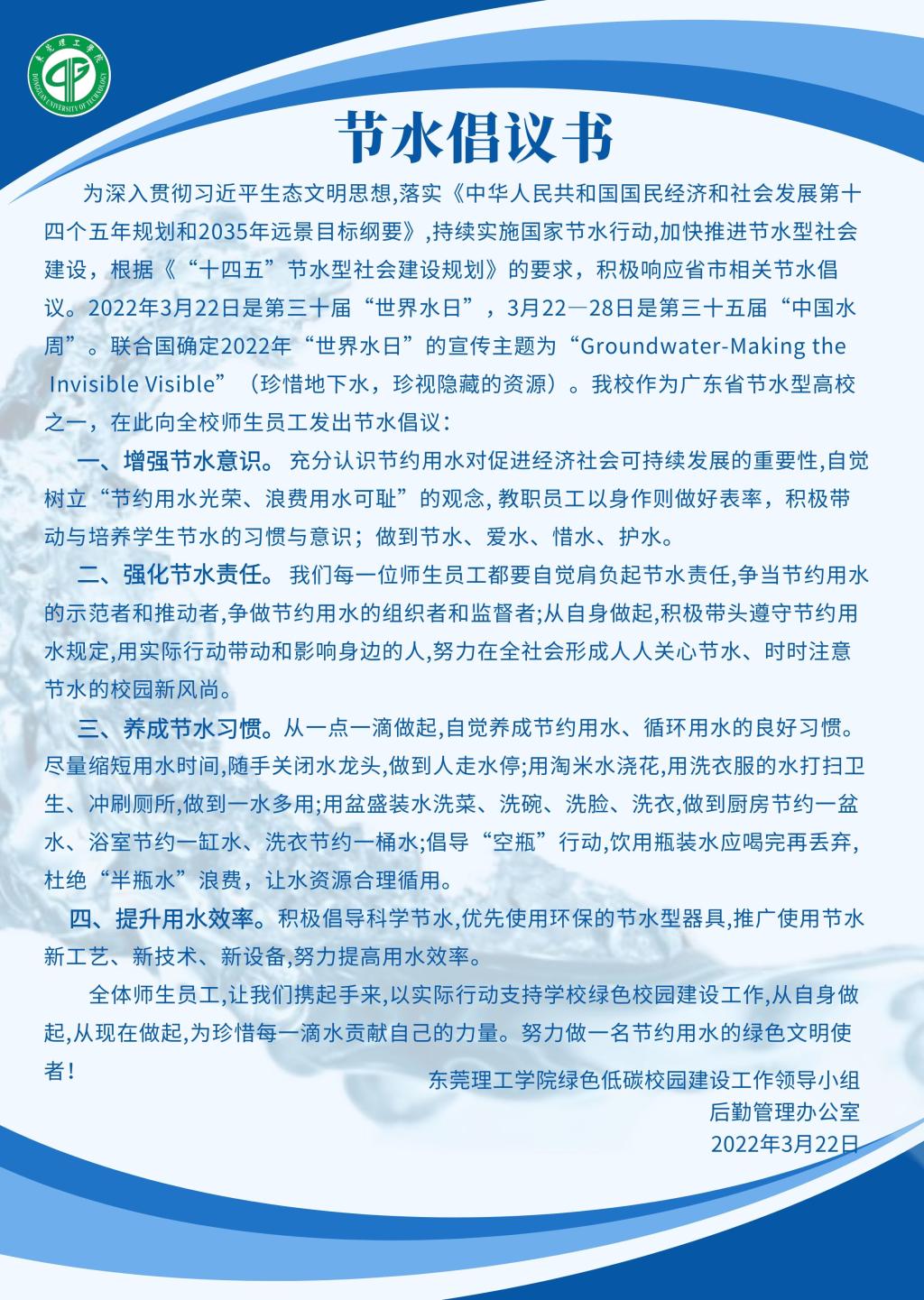 为深入贯彻习近平生态文明思想,落实《中华人民共和国国民经济和社会发展第十四个五年规划和2035年远景目标纲要》,持续实施国家节水行动,加快推进节水型社会建设,根据《“十四五”节水型社会建设规划》的要求,积极响应省市相关节水倡议。2022年3月22日是第三十届“世界水日”,3月22—28日是第三十五届“中国水周”。联合国确定2022年“世界水日”的宣传主题为“Groundwater-Making the Invisible Visible”(珍惜地下水,珍视隐藏的资源)。我校作为广东省节水型高校之一,在此向全校师生员工发出节水倡议: