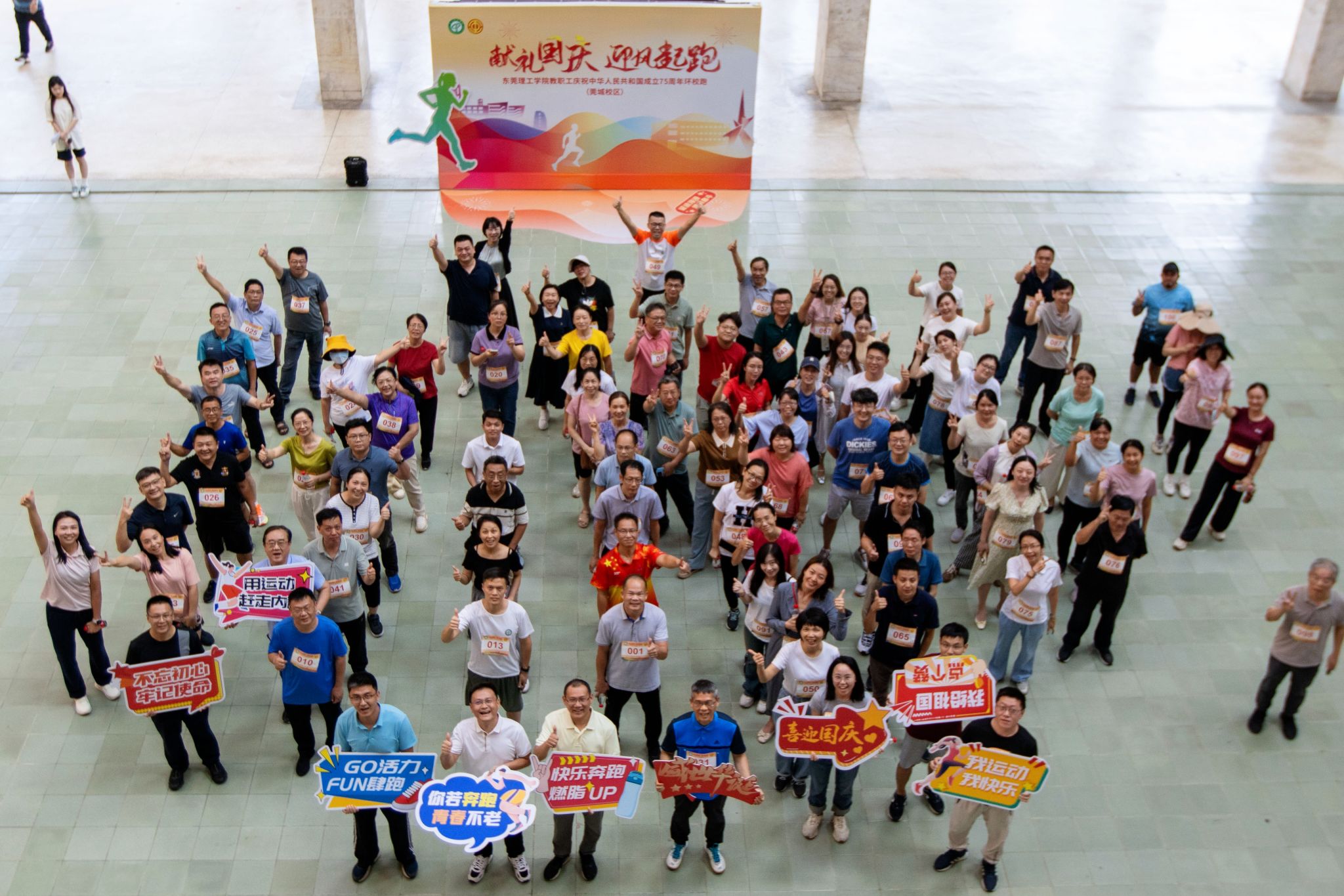 随着环校跑开跑指令下达,参加活动的教职工依次从四号楼大厅出发,途经综合楼、图书馆、田径场、食堂等学校标志性建筑。伴随着跑动的身影迎风向前,奔跑的脚步中充满了激昂与热情,生动表达着莞工教职工对祖国最诚挚的祝福与热爱。