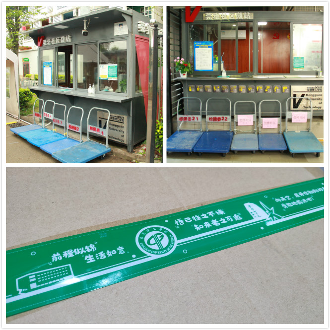 为方便毕业生离校,学校还准备了一批纸箱和印有学校元素的胶带供毕业生打包使用。并在两校区的学生社区微站及校门安保亭附近放置了30台手推车,供毕业生自由借用,为毕业生搬运行李、顺利离校提供帮助。
