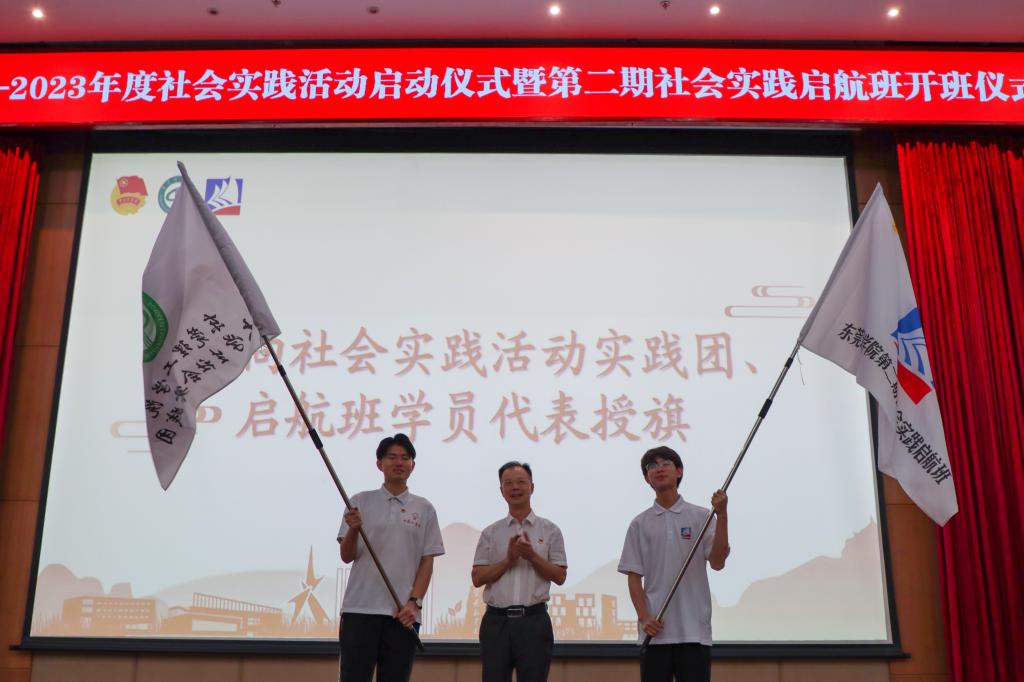仪式中,李忠红向2022-2023年度社会实践活动实践团代表及2022年社会实践启航班学员代表授会实践团团旗与社会实践启航班班旗。
