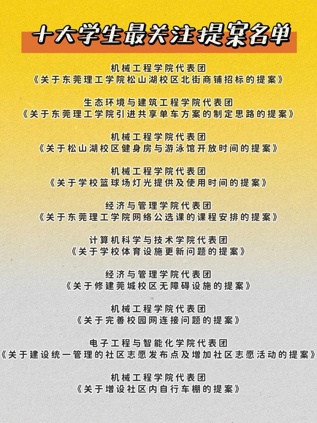 会前,第二十次学代会、第三次研代会筹备组精选出20份本科生优秀提案、8份研究生优秀提案作微信巡展,并在学生群体中举行了投票,最终选出《关于完善校园网连接问题的提案》等10份学生最关注的提案、《关于飞机楼及23、24栋宿舍楼的校园网优化的提案》等5份研究生最关注的提案。法律与社会工作学院(知识产权学院)、生态环境与建筑工程学院、经济与管理学院、机械工程学院、计算机科学与技术学院被评为优秀提案组织单位。