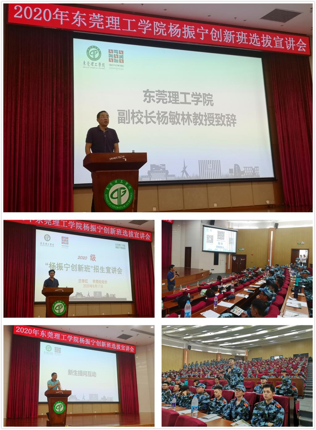 9月17日,我校2020级杨振宁创新班(以下简称为杨班)新生选拔宣讲会于松山湖校区会议中心报告厅举行。校党委委员、副校长杨敏林,教务处、知行学院相关负责人,杨班辅导员以及通过初轮资格审核的470余名2020级新生参加宣讲会。