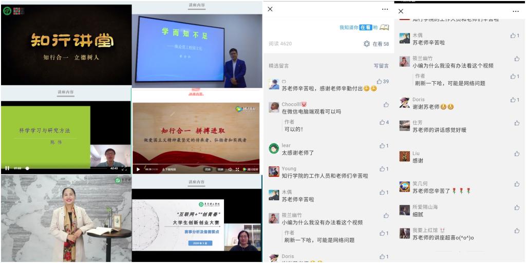 据悉,线上“知行讲堂”每周做1-2期,目前做的8期分别从“疫情心理调适”“爱国主义教育”“学习与学术研究”“校园文化”“创新创业比赛”“毕业生教育”等方面为学生开讲,主讲人分别有党委学生工作部部长、学生处处长、学生社区党工委书记黄金和,粤台产业科技学院院长、知行学院副院长陈伟,知行学院专职副院长苏亚玲,校团委书记、学生社区党工委委员劳丹,知行学院莞和分院副院长毛安翼博士,以及社区优秀学生代表陈晓展同学。在这8期讲堂中,同学们与院长、老师、学长线上相遇,体验积极情绪、挖掘积极人格品质,抗击疫情带来的心理焦虑,表达爱国情怀,积极备赛“创新创业”项目,完善科学学习与研究方法,提高心理素质和学业能力。
