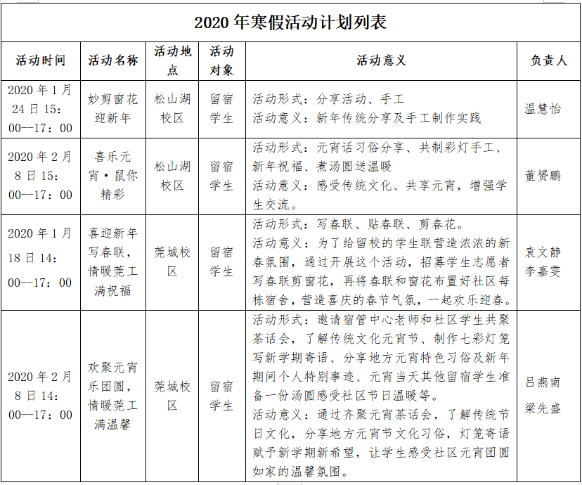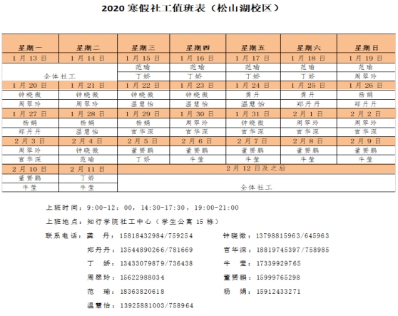 据悉,在会议开始前,7个分院分别开展“辞旧迎新”社区除尘暨春节布置工作,营造温暖的社区环境。学院制定工作人员寒假值班表和活动计划表,让留校学生可以在社区与老师们一起过春节中,感受社区“家”的温暖。(具体活动安排与值班表如下)