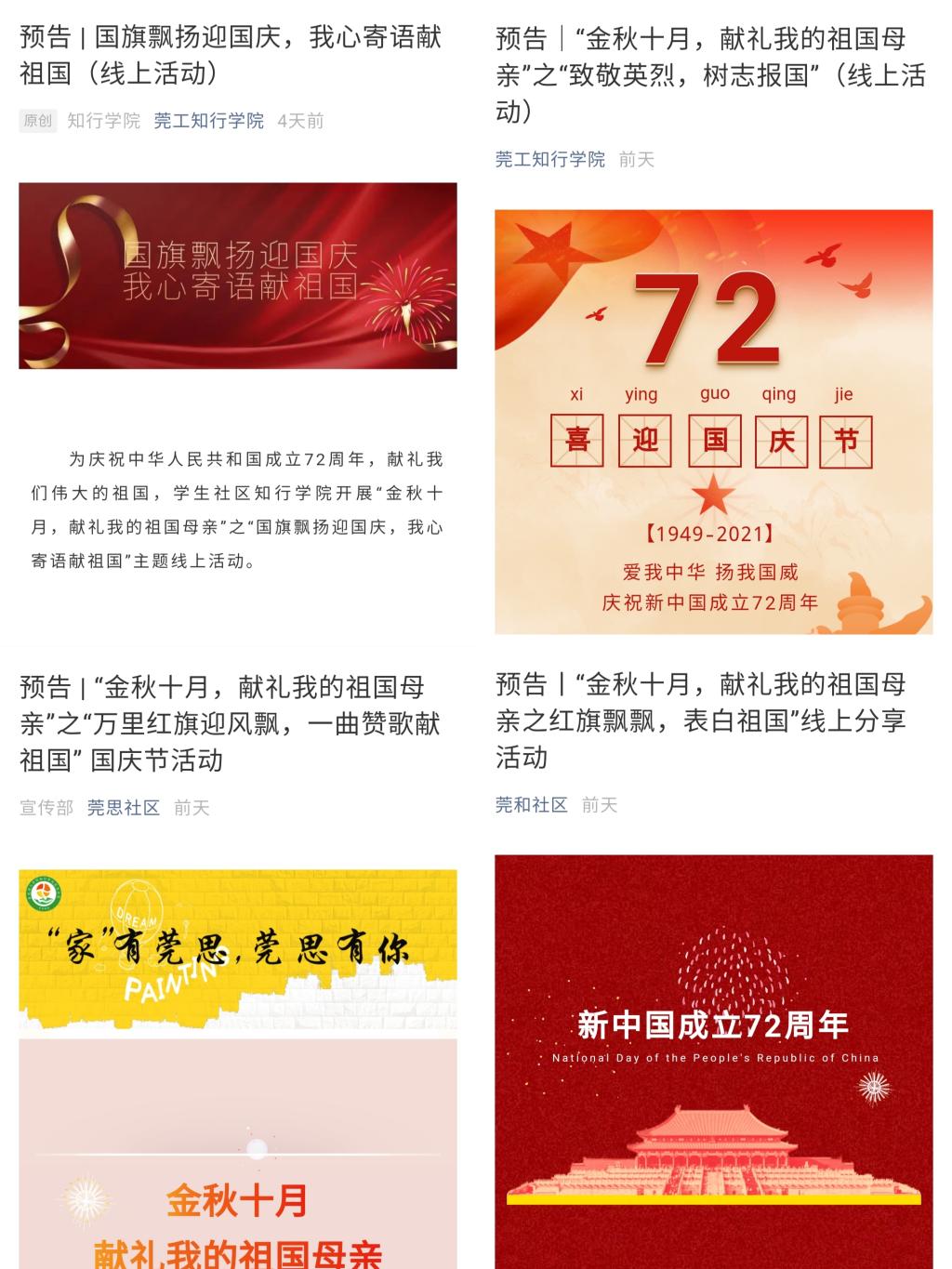 为庆祝中华人民共和国成立72周年,献礼伟大的祖国,9月29日起,学生社区知行学院于两校区开展“金秋十月,献礼我的祖国母亲”系列活动。线上、线下共计10场,累计参与985人次。