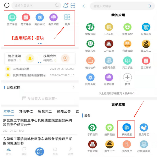 (2)在i莞工APP【应用服务】模块依次点击【更多】、【系统检索】,并在搜索栏输入所要查询的系统或网站名称。