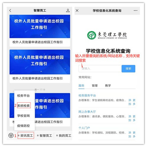 前往【智慧莞工】公众号,依次点击下方菜单栏【资讯莞工】->【系统检索】,并在搜索栏输入所要查询的系统或网站名称即可。