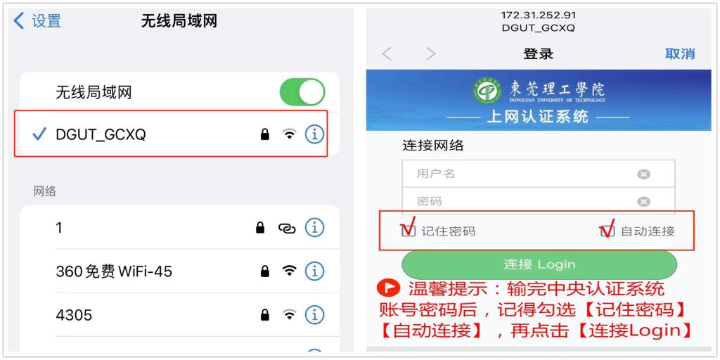 无线网络覆盖范围内,师生可在手机端打开无线局域网,连接DGUT_GCXQ(密码为8个1),再输入中央认证系统账号密码,勾选【记住密码】【自动连接】后登录即可畅享全程高速、安全便捷全光网络。